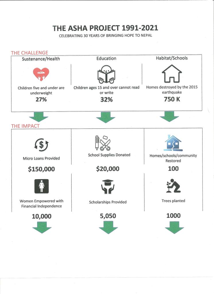 It is amazing how a short, four letter words can represent so much. ASHA means HOPE in Nepali, and that is our purpose. I would like to personally thank you for being a part of the team. Your support for the ASHA PROJECT has transformed the lives of not just individuals, but entire communities, empowering them with the tools to break the cycle of poverty.